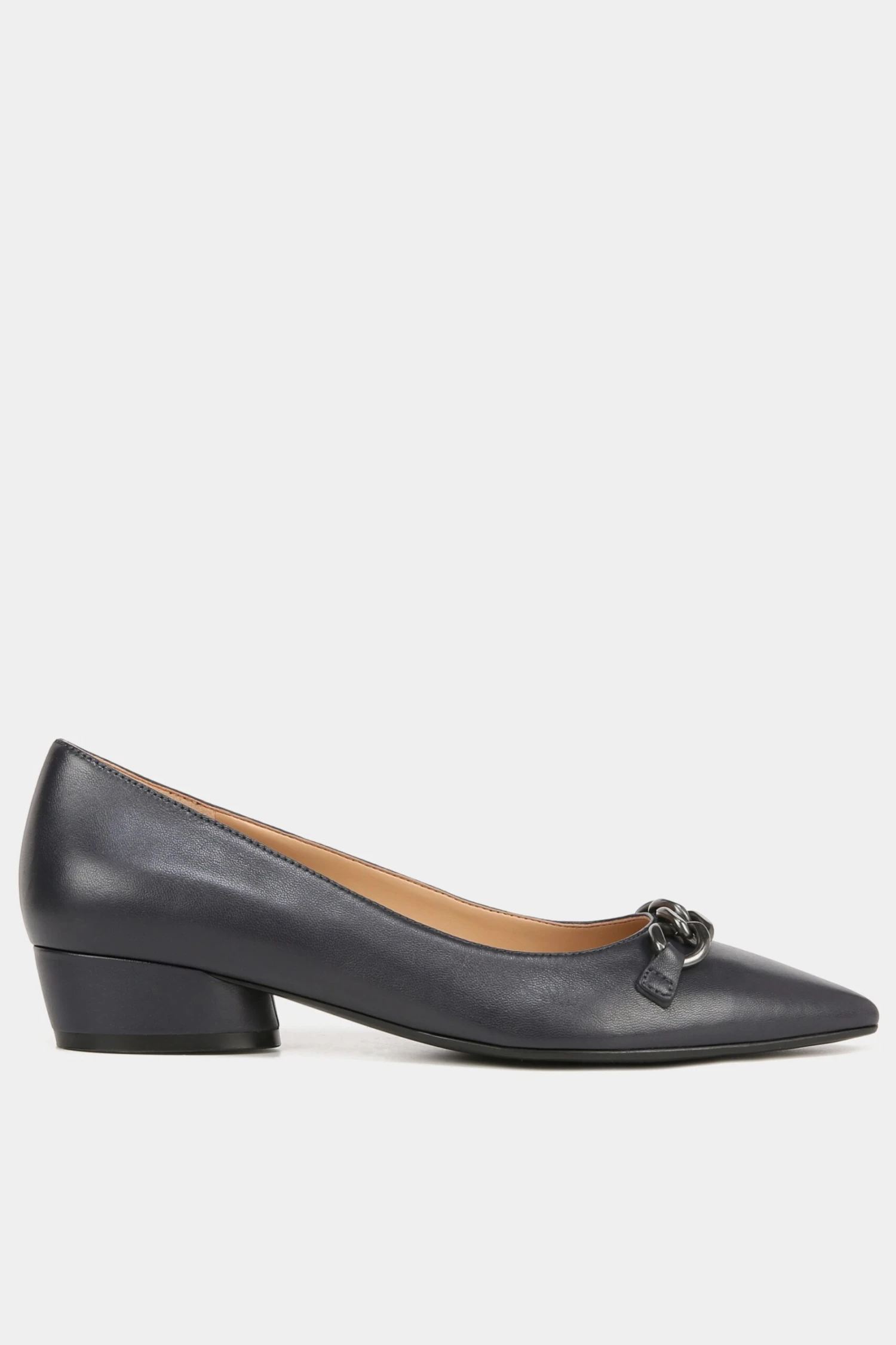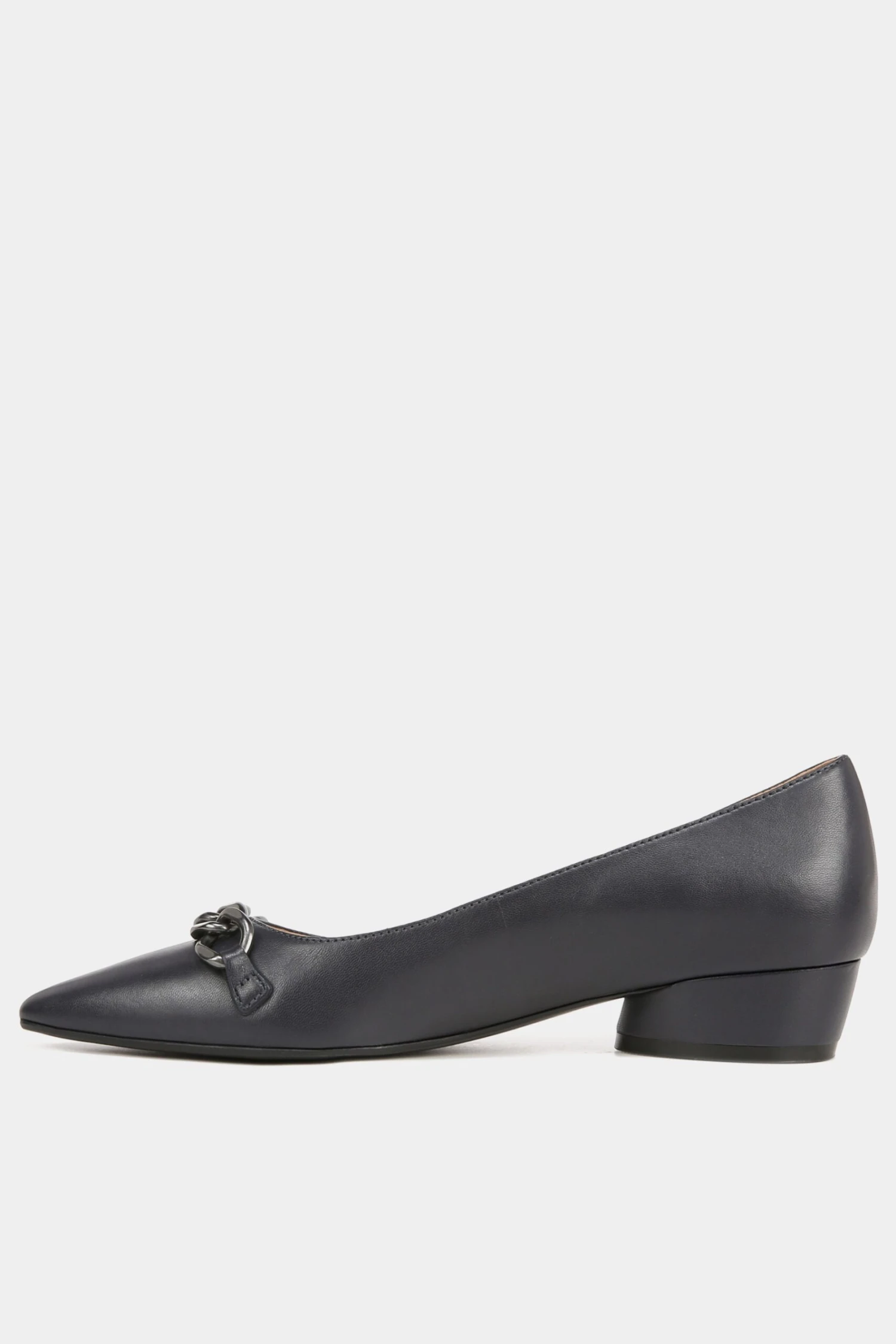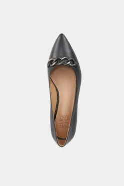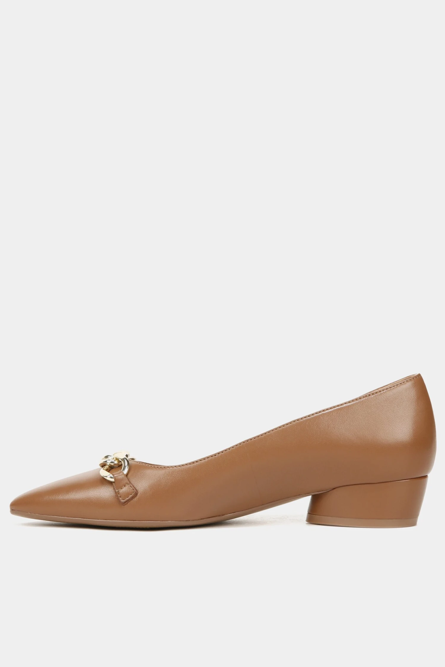 Comfort on point. Polished metallic hardware accentuates the look of this all-day, elevated dress flat. A pointed toe, cool flared block heel with a just-right height and an easy slip-on fit completes this contemporary silhouette.